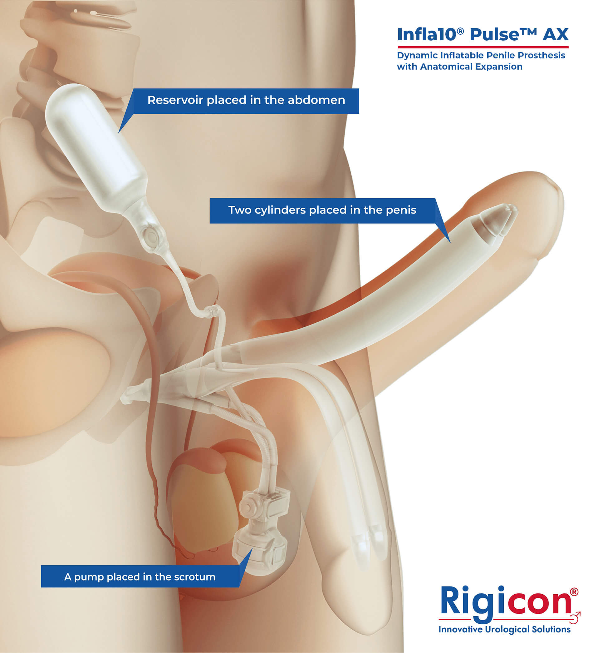 يقدم جهاز Infla10® Pulse™ AX خيارًا محتملاً للرجال الذين يبحثون عن وظيفة انتصاب أكثر طبيعية مع سهولة استخدام جهاز قابل للنفخ ديناميكي. يتكون هذا النظام المكوّن من ثلاثة أجزاء من أسطوانتين قابلتين للنفخ موضوعة داخل القضيب، وخزان مملوء بالسائل موضوع في البطن، ومضخة موضوعة بشكل خفي في كيس الصفن. عند الضغط على المضخة، ينتقل السائل من الخزان إلى الأسطوانات، مما يخلق انتصابًا قويًا وطبيعي المظهر.
